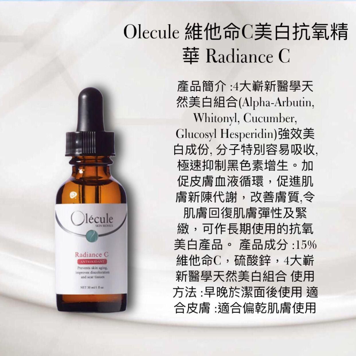 Olecule品牌產品使用醫學級專業配方並採用最新的技術提取更微小的分子,使有效成份更能滲透皮膚層,加快皮膚細胞再生延緩肌膚衰老。MD Research結合植物天然的精華,突破了近代的護膚科技與技術,創造出獨特的護膚產品系列---Olecule,重新創造一種使皮膚更生的技術,打造了醫學美容的新里程碑,以達到更頂級層次的功效。 Olecule品牌以由外到內的護膚概念於不同的肌膚層作出保護及修復作用。頂尖技術配合醫學配方令有效成份帶進肌膚。獨特的配方針對性的解決及預防環境造成皮膚受損與老化並具有亮白皮膚、防止並抑制色素沉澱(hyperpigmentation)、保濕潤澤肌膚。 Olecule經由皮膚科醫生測試,不會產生粉刺(non-comedogenic)、無刺激性、通過皮膚過敏測試,絕無動物性測試。